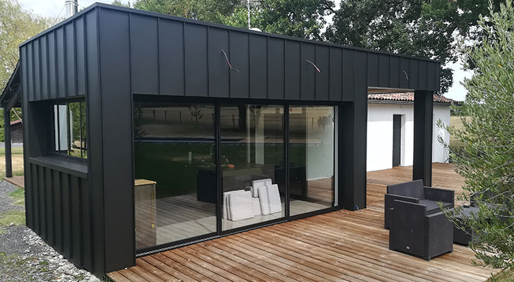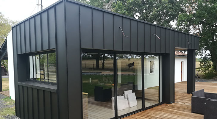 Pour cette extension de maison individuelle, l’équipe Art et Toitures a réalisé un bardage à joint debout vertical noir.
