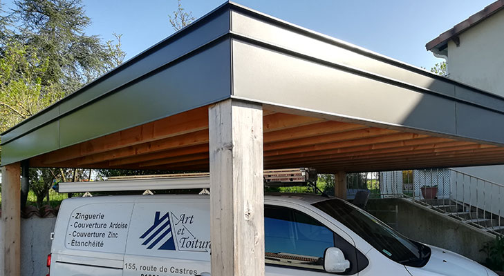 Pour le carport de ce client, l’équipe Art et Toitures a réalisé un habillage de bandeau à joint debout horizontal en Alu laqué gris.